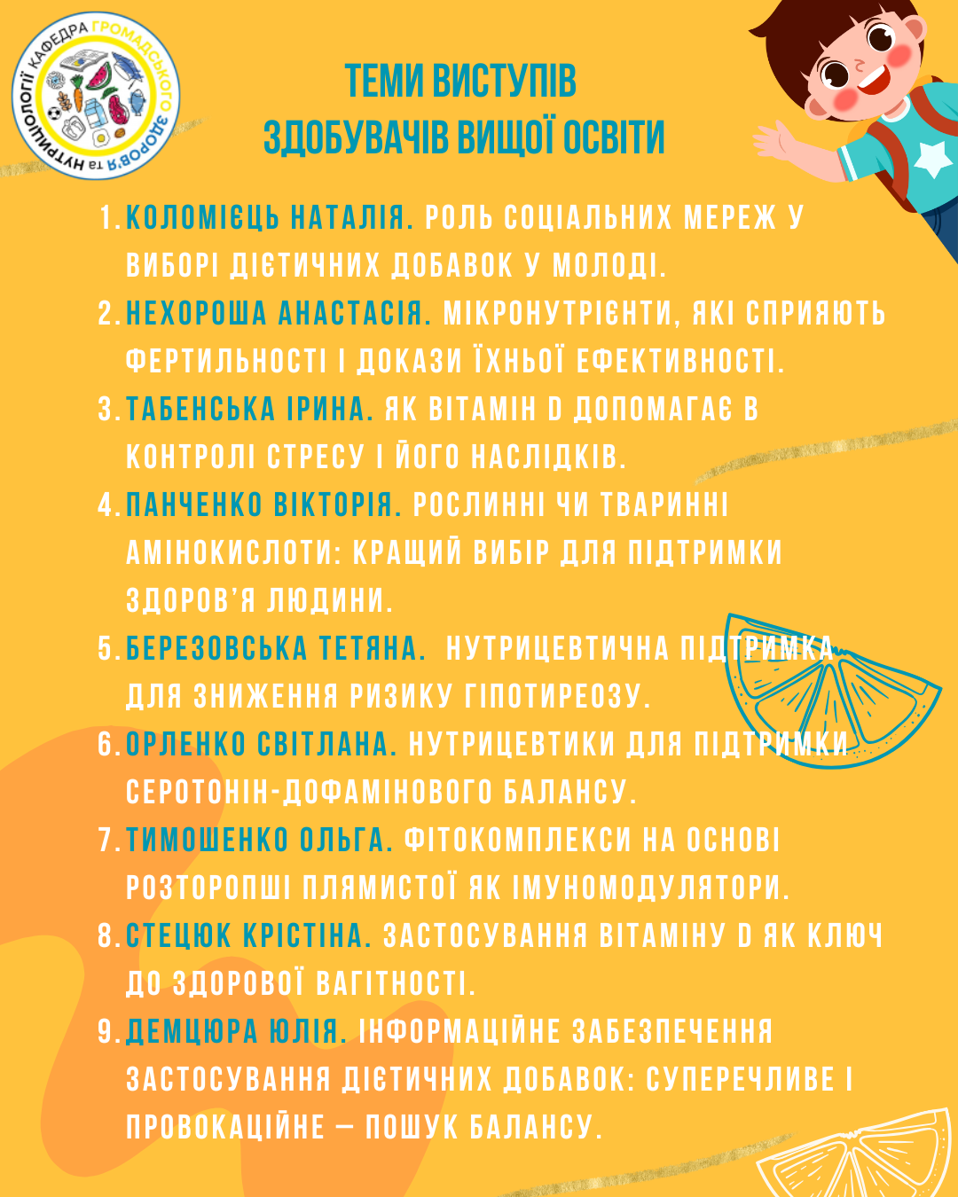 Кафедра громадського здоров'я та нутриціології радо запрошує студентів, викладачів та всіх, хто цікавиться темою здорового способу життя, на чергову зустріч нашого Наукового хабу. Цього разу ми презентуємо оновлений формат заходу - апробацію доповідей, де головними спікерами стануть самі здобувачі вищої освіти. Це чудова нагода почути свіжі думки та результати досліджень молодих науковців, які глибоко занурилися в тему застосування дієтичних добавок.