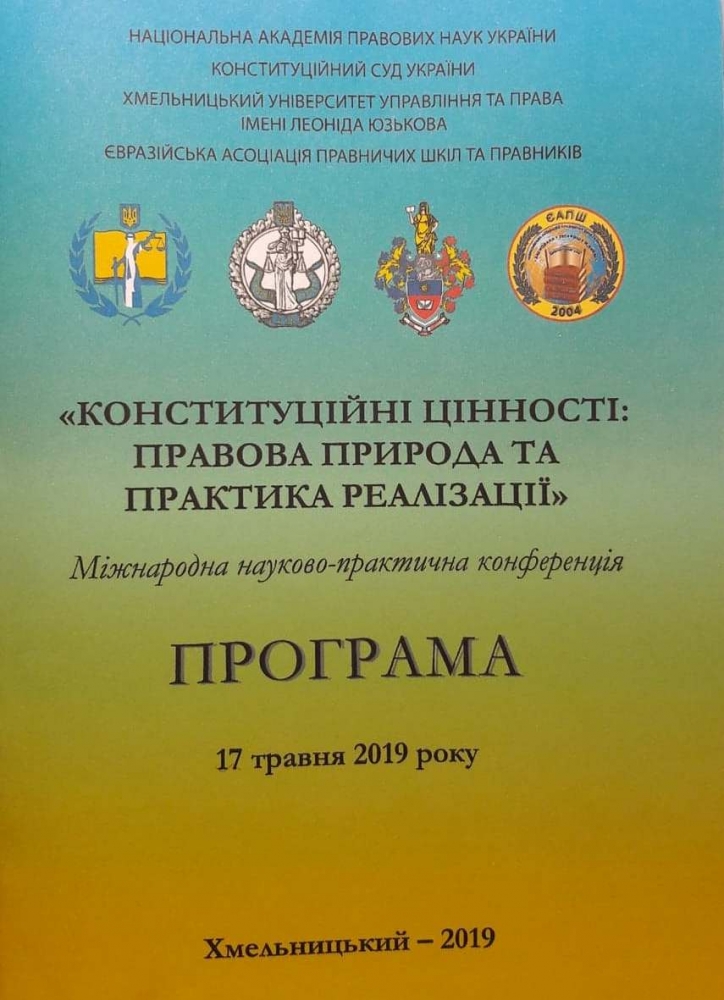 17 травня 2019 року в Хмельницькому університеті управління та права імені Леоніда Юзькова (м. Хмельницький) відбулася Міжнародна науково-практична конференція «Конституційні цінності: правова природа та практика реалізації», в якій взяла участь завідувач кафедри Віра Качур.