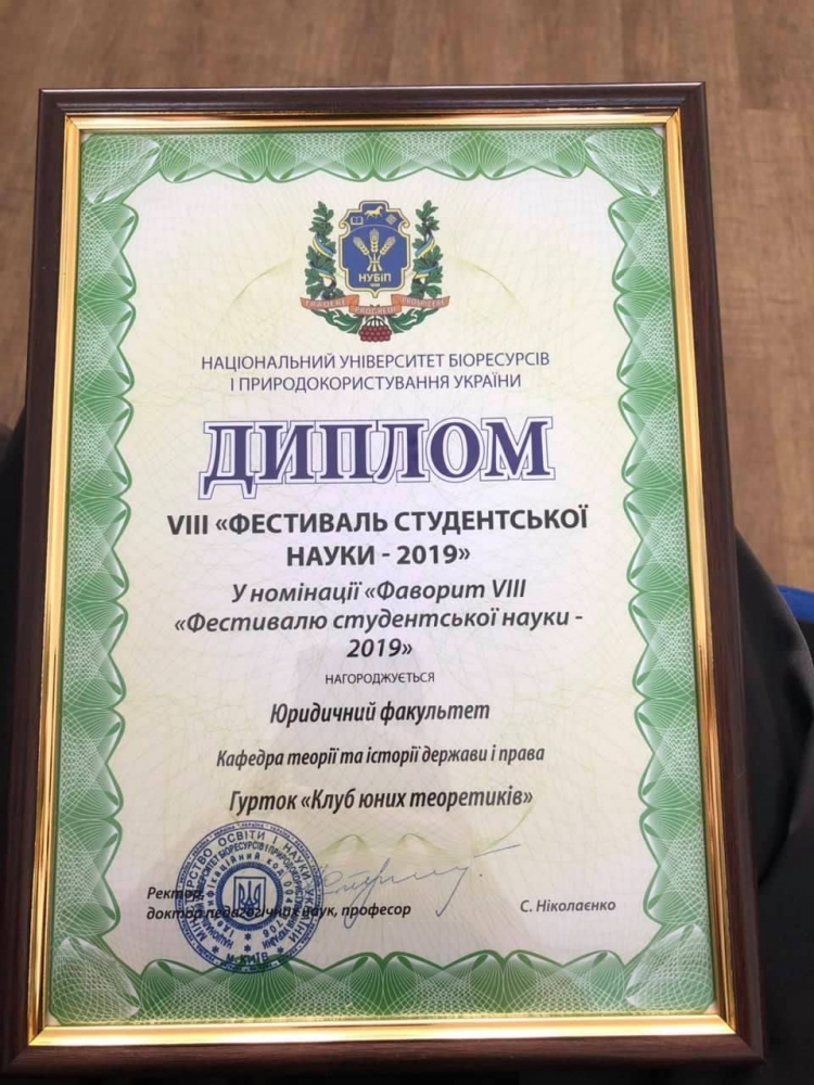 Приємно відзначити, що студентський науковий гурток «Клуб юних теоретиків», що функціонує при кафедрі теорії та історії держави і права, 14 травня 2019 року прозвітував про свою діяльність на другому етапі та отримав номінацію «Фаворит VІІІ «Фестивалю студентської науки - 2019».