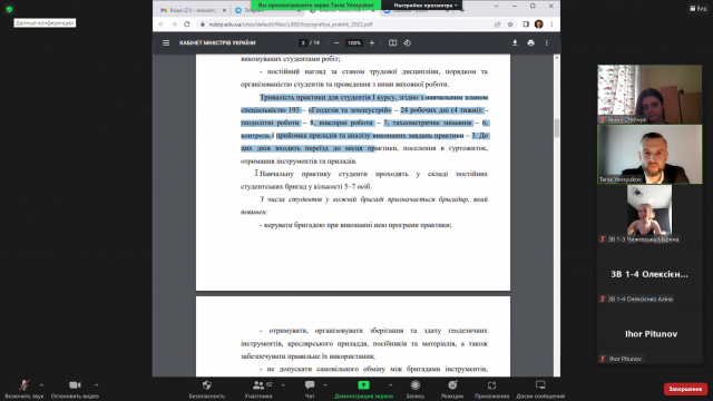 Вже з 18 липня 2022 року у 88 здобувачів освітньої програми «Геодезія та землеустрій» факультету землевпорядкування розпочинається чотиритижнева навчальна практика з дисципліни «Топографія» - одна з найважливіших компонентів практичної підготовки землевпорядників та геодезистів. Саме тому, лектором потоку кафедри геодезії та картографії, професором Тарасом Євсюковим та керівниками практики доцентами Євгенією Кривов’яз, Оленою Малашевською, В’ячеславом Богданцем та асистентом Яніною Степчук 12 липня 2022 року було проведено установчу зустріч зі студентами першого курсу факультету землевпорядкування, що стосувалася організації проведення навчальної практики з дисципліни «Топографія» та особливостей її проходження в умовах воєнного стану. Відеоконференція відбулася на платформі Zoom.