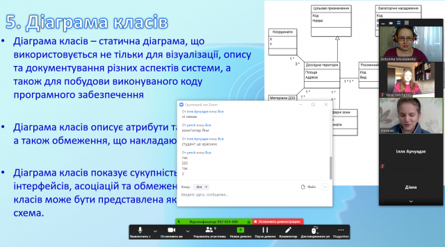 До традиційного використання розробленого та атестового елетронного навчального курсу застосований інший засіб ведення занять – сервіс Zoom. Антоніна Москаленко використовує його під час проведення лекцій і лабораторних занять з дисципліни "Проектування баз геопросторових даних". Зокрема до проведеної 25 березня лекції могли долучитись всі охочі, перейшовши за посиланням в оголошенні на сайті кафедри. Засвоїти ж тему «Проектування баз геоданих на основі UML діаграм» виявилось не просто. Тому студенти додатково використовували запитання в чаті. А на наступній парі всі разом долучились до виконання лабораторної роботи. І тут теж ЕНК був доповнений Zoom, оскільки розбирати разом нюанси етапів проектування баз геопросторових даних і цікавіше, і пізнавальніше.