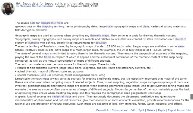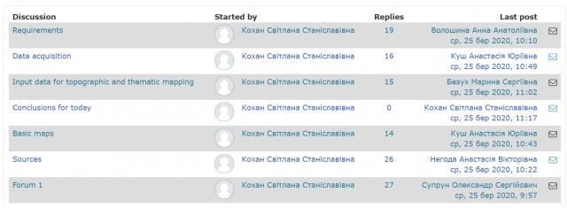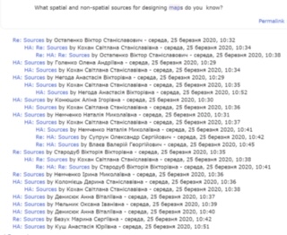 Не вийняток і дисципліна «Геоінформаційні технології». Для того, щоб встигати оцінювати відповіді й дискутувати з учасниками Форуму, до проведення заняття долучились відразу два викладачі – Світлана Кохан і Анатолій Востоков. Студенти самі виявили раціональний підхід – відповідь давати не лише у вигляді опису, але й у вигляді зображення.