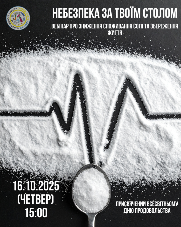 16 жовтня, у Всесвітній день продовольства, Кафедра громадського здоров’я та нутриціології НУБіП України проведе відкритий вебінар, присвячений питанням контролю споживання солі та його впливу на здоров'я.