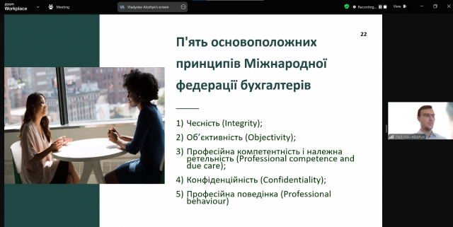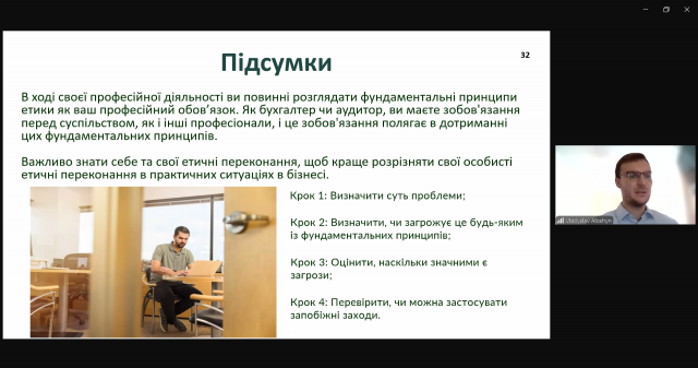 Цікавою та змістовною була доповідь Владислава Альошина, заступника генерального директора з МСФЗ ТОВ «ЕЙЧ ЕЛ БІ Юкрейн», здобувача PhD на тему «Професійна етика бухгалтера і аудитора: фундаментальні принципи забезпечення престижу професії».
