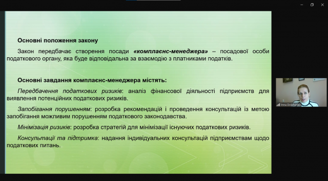 У своїй доповіді Інна Долженко, доцент кафедри фінансів, зупинилась на нововведеннях, тенденціях та проблемах розвитку оподаткування в Україні.