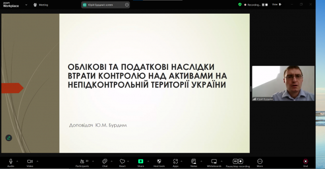 Надзвичайно актуальною була доповідь провідного економіста відділу звітності Департаменту фінансового планування та звітності ТОВ «Газорозподільні мережі України», здобувача PhD Юрія Бурдима, присвячена обліковим та податковим наслідкам втрати контролю над активами на непідконтрольній території України.
