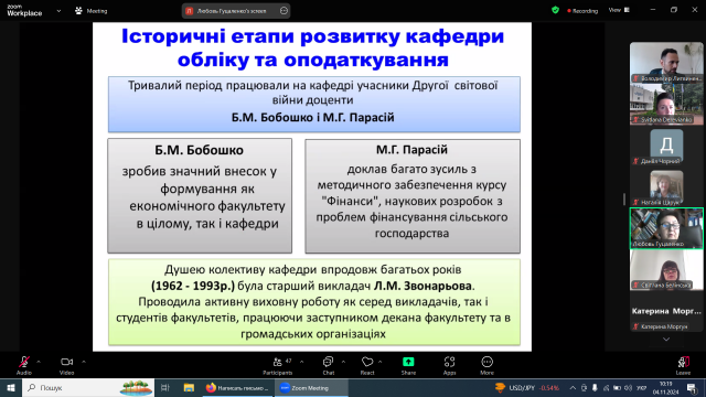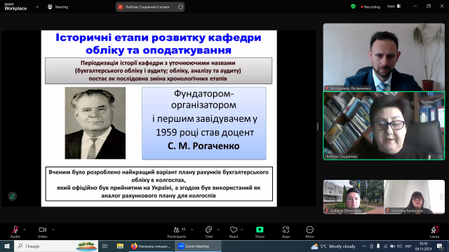 Професор кафедри обліку та оподаткування, доктор економічних наук, професор Любов Гуцаленко презентувала учасникам здобутки, про які вже можна говорити з гордістю за 65-ти річний період, окреслила інноваційні цілі та завдання, фундаментом яких стали саме історичні надбання вчених-попередників (Сергія Рогаченка, Ігоря Малишева, Михайла Парасія, Григорія Кірейцева, Людмили Звонарьової, Ольги Вербило, Людмили Шатковської, Леоніда Сука та багатьох інших).