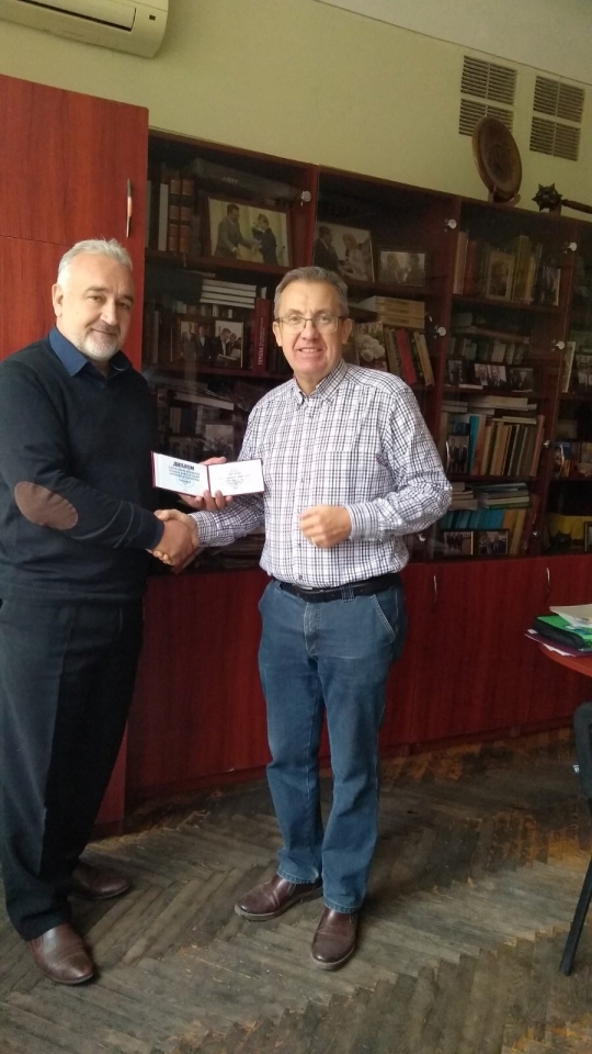 Віктор Анатолієвия Вергунов вручає диплом члена-кореспондента НААН України зі спеціальності "Публічне управління та адміністрування" доктору