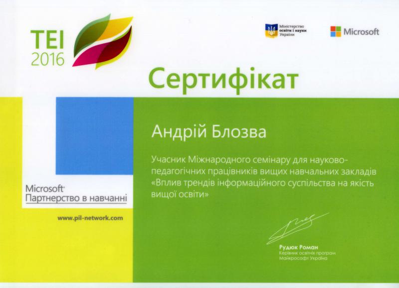 15 квітня 2016 року викладачі факультету інформаційних технологій прийняли участь у Міжнародному тренінговому семінарі для науково-педагогічних працівників вищих навчальних закладів «Вплив трендів інформаційного суспільства на якість вищої освіти», який відбувся в Київському університеті імені Бориса Грінченка. Семінар реалізовано в рамках ініціативи Microsoft Corp – Tutor Education Initiative за підтримки Міністерства освіти та науки України.