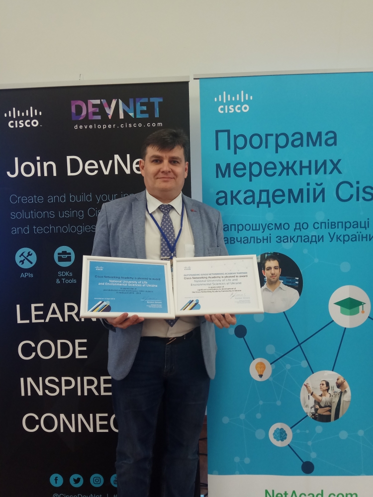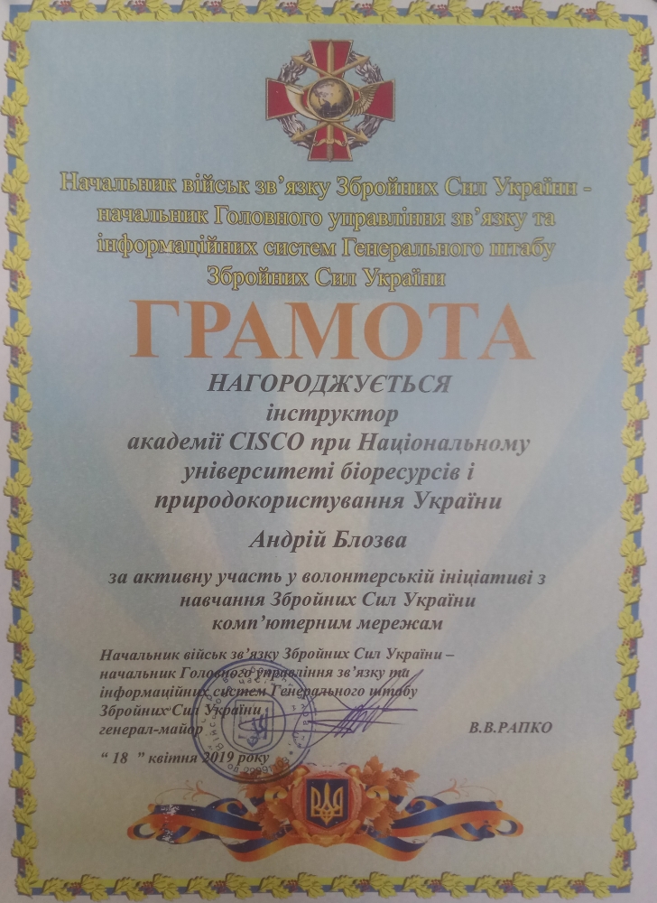 За особливі заслуги був окремо відзначений - керівник академії CISCO при НУБіП України Андрій Блозва, доцент кафедри комп’ютерних систем і мереж. Він отримав подяку за активну участь у волонтерській ініціативі з навчання комп’ютерним мережам Збройних Сил України від начальника військ зв’язку Збройних Сил України генерал-майора В.В.Рапко.