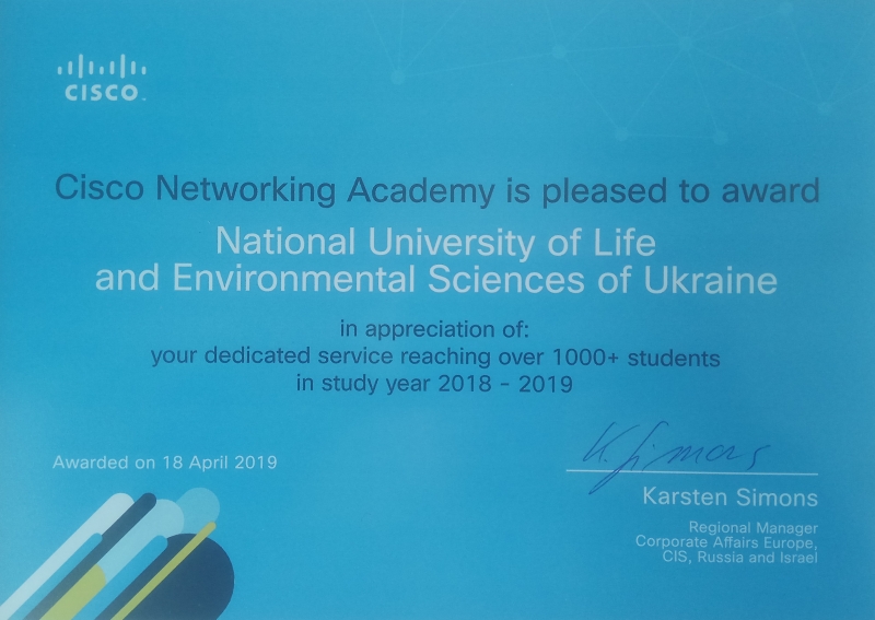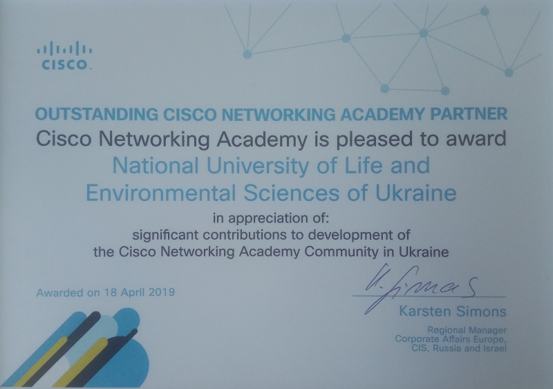 На нагородженні відмічали найкращих членів мережевої академії CISCO в Україні. Карстен Сімон нагородив Національний університет біоресурсів і природокористування України дипломом за значний внесок у розвиток спільноти CISCO Networking Academy в Україні.