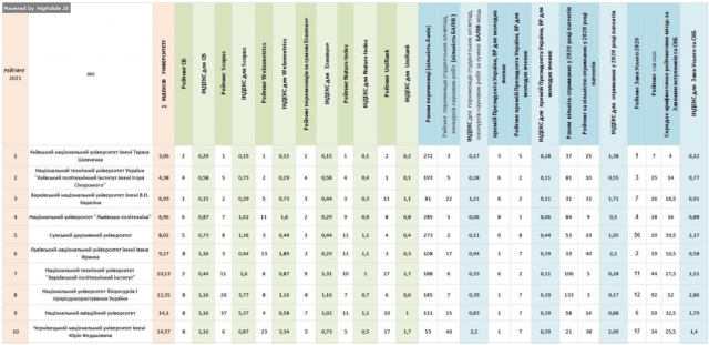 Серед критеріїв оцінювання: позиціонування вишів у рейтингах QS World University Rankings, Webometrics, Nature Index, UniRank, публікаційна активність у виданнях, що входять до міжнародної наукометричної бази Scopus. До уваги бралася участь в програмах Erasmus+ Європейського Союзу, результати Всеукраїнських студентських олімпіад 2018/2019 і конкурсів наукових робіт 2019/2020 (за сумою балів), отримані премії Президента України та Верховної Ради України для молодих вчених, кількість патентів, зареєстрованих вченими університету в 2020р. І ще один показник - середнє зважене значення для рейтингів ЗВО за кількістю заяв, поданих абітурієнтами, та середнім конкурсним балом в 2020 році.