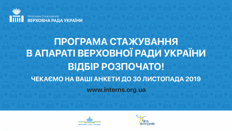 Уже вкотре Апарат Верховної Ради України та громадська організація «Ліга інтернів» запрошують молодь взяти участь у Програмі стажування молоді в Апараті Верховної Ради України, що здійснюється відповідно до Розпорядження Першого заступника Керівника Апарату Верховної Ради України № 3000-К від 30 жовтня 2019 р.