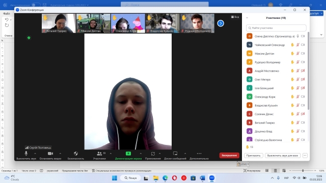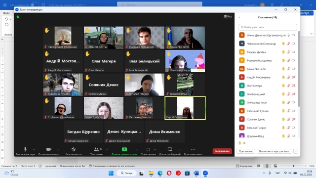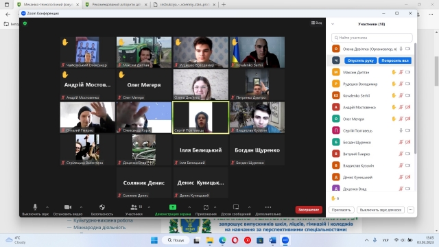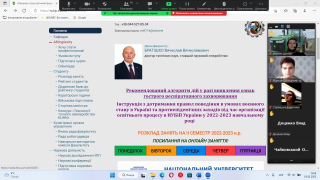 03 березня 2023 року доцент кафедри технічного сервісу та інженерного менеджменту імені М. П. Момотенка Олена Дев'ятко в онлайн-режимі провела кураторську годину з академічною групою АІ2201 механіко-технологічного факультету НУБіП України. В ході обговорення окреслено вирішення нагальних питань першого місяця зимово-весняного семестру 2022/2023 навчального року: