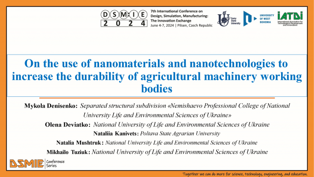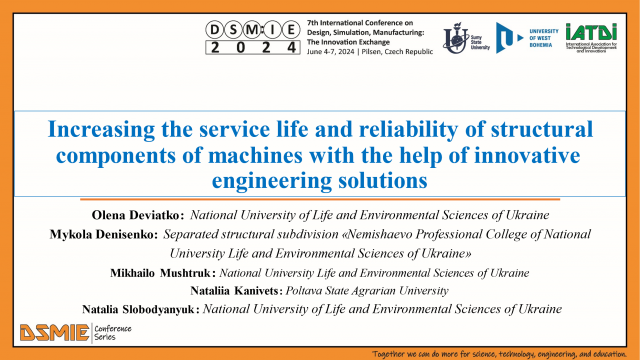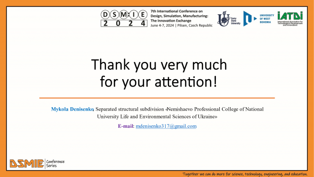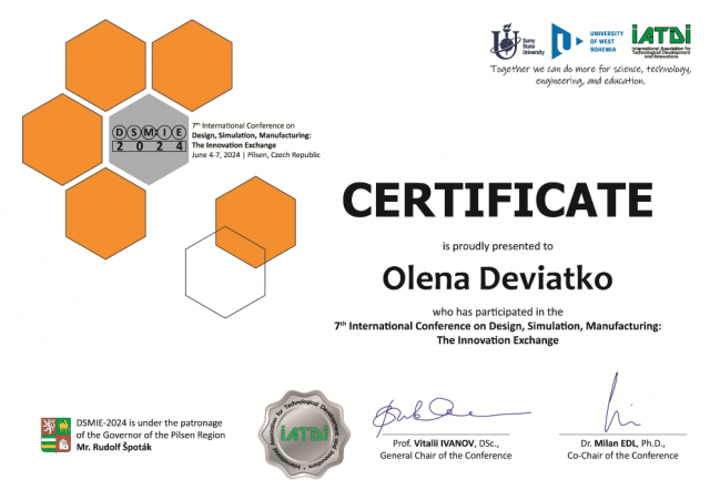 6 і 7 червня 2024 року доцент кафедри технічного сервісу та інженерного менеджменту імені М. П. Момотенка Олена Дев'ятко - учасниця 7th International Conference DSM:IE2024 Design, Simulation, Manufacturing: The Innovation Exchange, яка відбулася в Чешській Республіці місті Пілзен. На пленарному засіданні було представлено дві наукові доповіді в онлайн-режимі. (Програма конференції pdf)