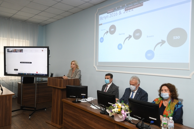Олена Григорівна відзначила, що з 2016 року зросла кількість освітніх програм ОС Бакалавр з 4-х до 7-ми, з 3-х до 5-ти - зросла кількість освітніх програм ОС Магістр, кількість науково-педагогічних працівників факультету за 5 років зросла 57 до 77, а викладачів з науковим ступенем стало на 21% більше і становить на сьогодні – 83%. За 5 останніх років зріс і контингент студентів факультету більше ніж у 2 рази (з 600 до 1300 студентів), зі 104 до 390 зросли набори на 1 курс студентів ОС Бакалавр.
