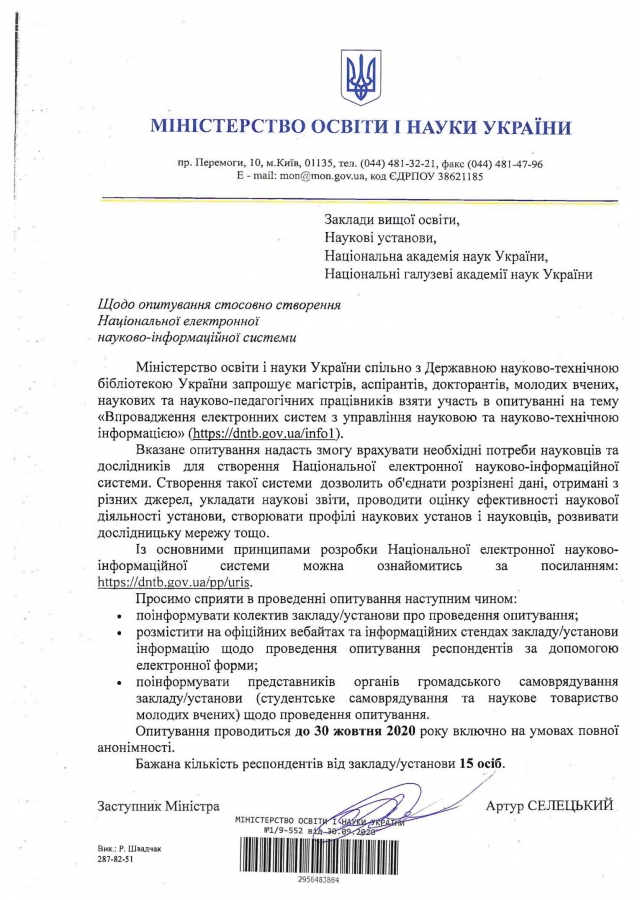 Опитування від МОН України щодо створення Національної електронної науково-інформаційної системи Посилання на анкету для проходження опитування: https://dntb.gov.ua/form1 1 жовтня 2020 року 03:00 - 03:00