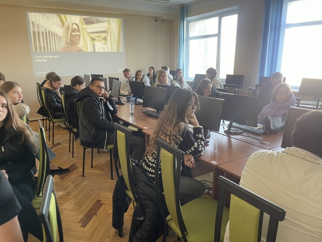 Спікерка Юлія Левцова звернула увагу на те, що фундаментом діяльності компанії є сильні цінності, серед яких – відповідальність, різноманітність і повага, технічна досконалість, незалежність. В компанії цінується індивідуальність, винахідливість, бажання постійно навчатись, розвиватись та вдосконалюватись. Юлія зауважила, що Forvis Mazars – «… це не лише про роботу, тут знаходять друзів на все життя», адже зв’язок підтримується навіть з тими, хто вже не працює в компанії. Особливу зацікавленість проявили четвертокурсники щодо повідомлення Юлії про комфортні умови праці для співробітників, серед яких: офіційне працевлаштування, можливість поєднання офісної віддаленої роботи, навчання на денній роботі і роботи за фахом в компанії з погодженим гнучким графіком, часткове покриття вартості курсів англійської мови, медичне страхування для працівника з першого дня працевлаштування та інші. Необхідно відмітити, що Forvis Mazars увійшла до рейтингу ТОП-25 роботодавців 2024 року, які активно співпрацюють з молоддю до 25 років (проводять освітні заходи, запрошують на стажування та роботу, беруть участь у різноманітних кар’єрних подіях та освітніх івентах).