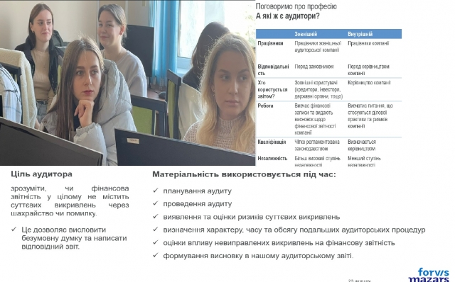 Старша аудиторка Forvis Mazars Наталія Ковтонюк проінформувала здобувачів про можливості розкриття знань, умінь і професійних навичок аудиторів, про те, що саме розвивати для успіху в професії (Hard & soft skills аудитора). Наталія Ковтонюк переконливо довела важливість для аудитора «… вміти слухати і чути; опрацьовувати інформацію, ставити отриману інформацію під сумнів (проявляти професійний скептицизм), покладатися на аудиторські докази, думати раціонально і неупереджено, вивчати існуючі альтернативи, правильно формувати навантаження, вміти делегувати завдання, аналізувати процес та презентувати результати, мати навички ведення переговорів та вирішення конфліктів, доступно пояснювати різні аспекти власної роботи колегам, як у ролі ментора для інтернів, так і для звітування перед керівництвом, мати базові знання щодо використання формул і функцій, зведених таблиць в програмі Excel».