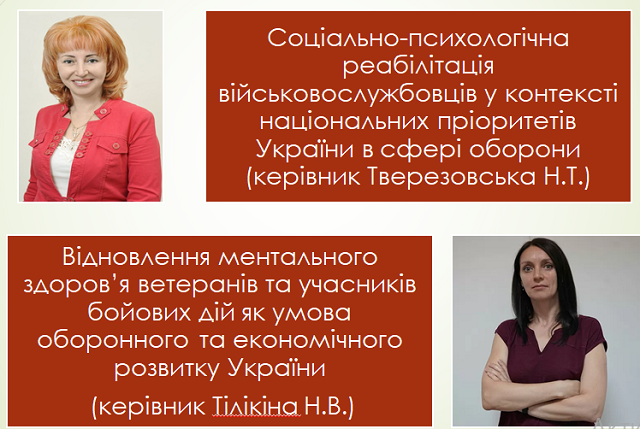 Кафедрою соціальної роботи та реабілітації НУБіП України подано 2 проєкти на Конкурс НДР до МОН України (Соціально-психологічна реабілітація військовослужбовців у контексті національних пріоритетів України в сфері оборони (керівник Тверезовська Н.Т.), Відновлення ментального здоров’я ветеранів та учасників бойових дій як умова оборонного та економічного розвитку України (керівник Тілікіна Н.В.).