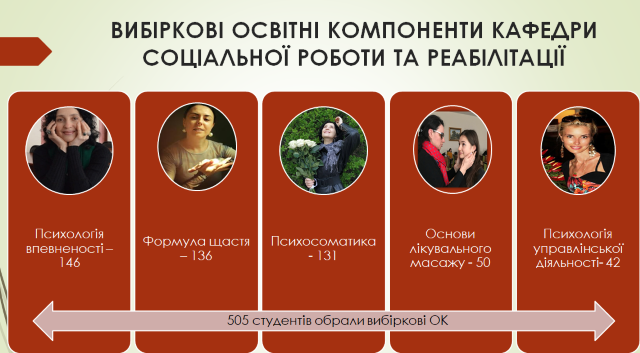 У 2024 році НПП кафедри соціальної роботи та реабілітації запропонували студентам ряд вибіркових освітніх компонентів, які користувалися великою популярністю. Загалом, 505 студентів обрали різні курси, серед яких найбільшим попитом користувалися «Психологія впевненості» (146 студентів), «Формула щастя» (136 студентів), «Психосоматика» (131 студент), «Основи лікувального масажу» (50 студентів) та «Психологія управлінської діяльності» (42 студенти). Ці курси дозволяють студентам розширювати свої знання та навички в галузях, що є важливими для майбутньої професійної діяльності.