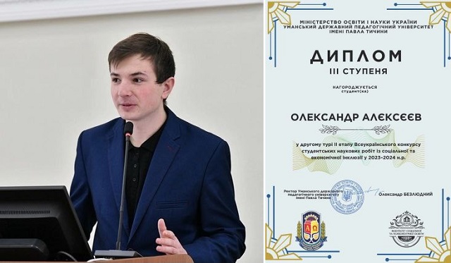 Ще одним здобутком і гордістю кафедри є виступ студента магістратури Алєксєєва Олександра на Всеукраїнському конкурсу студентських наукових робіт із соціальної та економічної інклюзії, який став призером і був нагороджений дипломом ІІІ ступеня.
