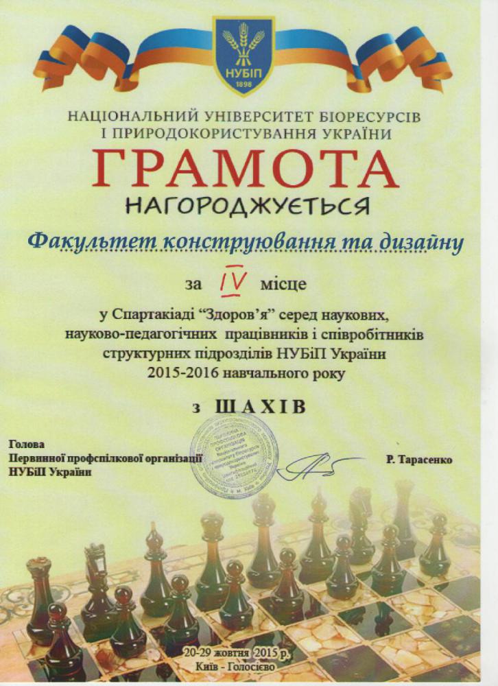 29 жовтня завершився турнір спартакіади „Здоров’я” з шахів серед наукових, науково-педагогічних працівників і співробітників структурних підрозділів НУБіП України 2015-2016 навчального року. Хочеться відмітити, що вперше сформована команда факультету конструювання та дизайну у складі чоловіків Гнилоскуренка С.В., Сиволапова В.А., Чаусова М.Г., Бистрого О.М., Несвідоміна В.М. та жінок Бондар М.М., Колісніченко Анастасії досягла досить високих результатів.