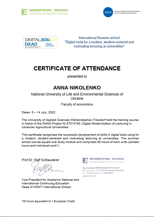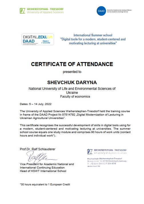 Студентки І курсу Ніколенко Анна та Шевчук Дарина взяли участь у Міжнародній літній школі в рамках проекту DAAD "Україна цифрова: забезпечення академічної успішності під час кризи". З 5 по 14 липня 2022 року віртуальна міжнародна літня школа була проведена міжнародною експертною групою, до складу якої входили 6 експертів з трьох українських університетів-учасників проекту та 3 європейських експерти у сфері диджиталізації.