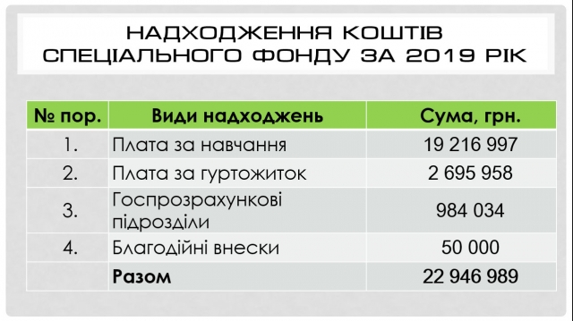 Разом надходжень коштів спеціального фонду нашого факультету за 2019 рік становить 22 млн 946 тис. гривень.