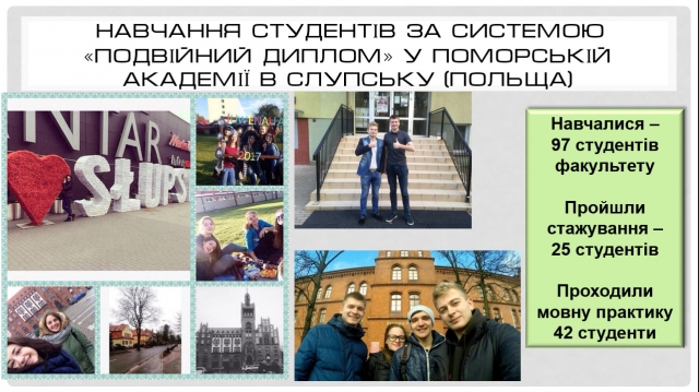 Зокрема, за укладеною угодою з Поморською академією в Слупську цього року паралельно здобували освіту 97 студентів факультету, проходило безкоштовне стажування – 25, а 42 студенти проходили мовну практику, що суттєво більше проти минулого року.