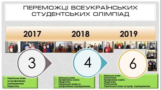 У звітному році кафедри факультету посилили роботу з підготовки до всеукраїнських студентських олімпіад. І маємо такі результати, а саме: друге місце на Всеукраїнському рівні завоювали чотири студенти нашого факультету, а саме: Марина Ширяєва з німецької мови; Юлія Маршак з української мови, Катерина Мамчур з психології;