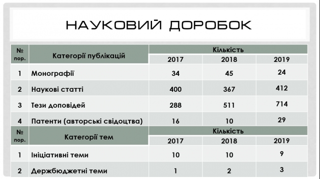 Порівняно з минулим роком кількість докторів наук збільшилася на 2 особи і становить 29 осіб. Кількість кандидатів наук у поточному році становить 115 осіб, що на 24 особи більше порівняно з минулим навчальним роком.