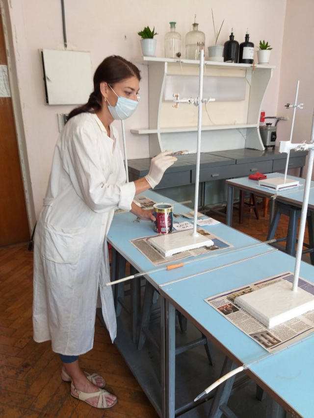 В кімнатах 40 і 33 (лабораторії “Ґрунтознавства та охорони ґрунтів”) пофарбовано бюретки, столи для титрування, витяжні шафи та шкафчики з реактивами.