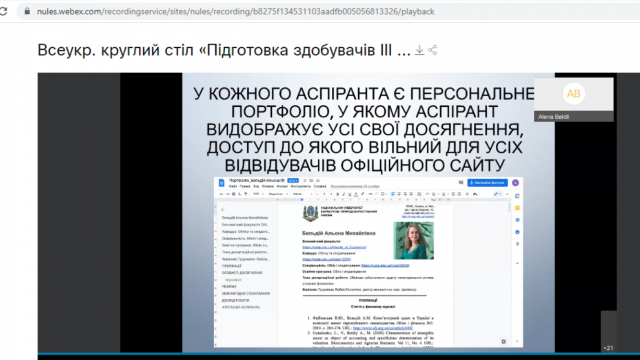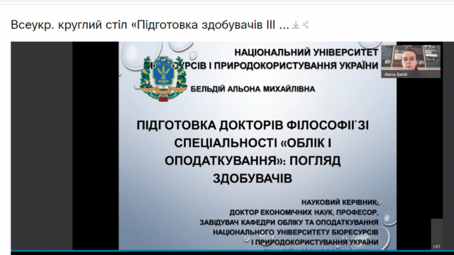 В роботі круглого столу прийняли участь здобувачі третього (освітньо-наукового) рівня вищої освіти з обліку і оподаткування Національного університету біоресурсів і природокористування України, Ганна Грищук, Олена Попова, Дарина Вакулик, Артур Дудніченко та Альона Бельдій, яка в своїй доповіді розкрила погляд здобувачів на процес підготовки докторів філософії зі спеціальності «Облік і оподаткування». Марія Шигун – завідувач кафедри бухгалтерського обліку та консалтингу Київського національного економічного університету ім. Вадима Гетьмана доєдналася до наукової дискусії та відмітила, що проблематику створення вузькоспеціалізованих освітньо-наукових програм та важливості також питань вибору керівника, рецензентів та опонентів До дискусійних обговорень долучилися й інші провідні науковці та практики: Євгенія Калюга (професор кафедри обліку та оподаткування НУБіП України), Сергій Бардаш (професор кафедри готельно-ресторанної справи та туризму НУБіП України), аспіранти-випускники: Олена Жовніренко - головний консультант секретаріату Комітету з питань економічного розвитку Апарату ВРУ, Інна Цвігун, завідувач кафедри обліку, оподаткування та технологій електронного бізнесу Подільського державного аграрно-технічного університету (м. Камянець-Подільський), Крістіна Федорченко. Перспективним напрямом подальшого вдосконалення підготовки докторів філософії є запровадження міжнародних програм співробітництва, зокрема шляхом реалізації програм міжнародної академічної мобільності. Здобувачі повинні мати можливість активно обговорювати результати своїх досліджень не лише з науковим керівником, але й з колегами, які працюють над схожими науковими проблемами. На завершення заходу професор Любов Гуцаленко подякувала учасникам круглого столу за цікаві доповіді, корисну зустріч та поради в напрямі удосконалення ОНП за спеціальністю "Облік і оподаткування", побажала всім учасникам наукових здобутків та плідної праці.