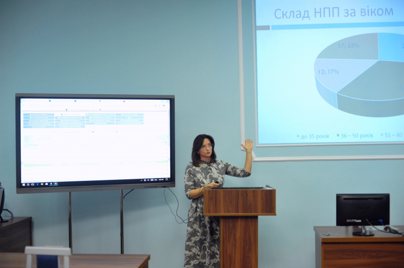 Олена Григорівна розпочала із того, що факультет постійно розвивається, про що свідчить діяльність 5 кафедр, які функціонують на факультеті. Освітній процес підготовки майбутніх фахівців з інформаційних технологій та економічної кібернетики забезпечують висококваліфікований науково-педагогічний склад, який нараховує 16 докторів наук, 35 кандидатів наук та 21 викладач без наукового ступеня.