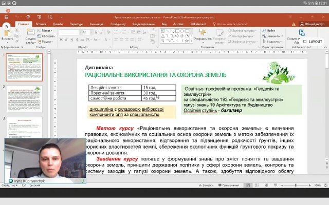 В межах заходів щодо моніторингу та перегляду освітньо-професійних та освітньо-наукової програм з метою забезпечення якості надання освітніх послуг відбулися розширені онлайн-засідання кафедр факультету землевпорядкування за участі гарантів бакалаврської та магістерської освітньо-професійних програм, стейкголдерів, на яких розглянуто зміст робочих програм дисциплін, їх важливість у формуванні компетенцій майбутніх фахівців спеціальності "Геодезія та землеустрій".