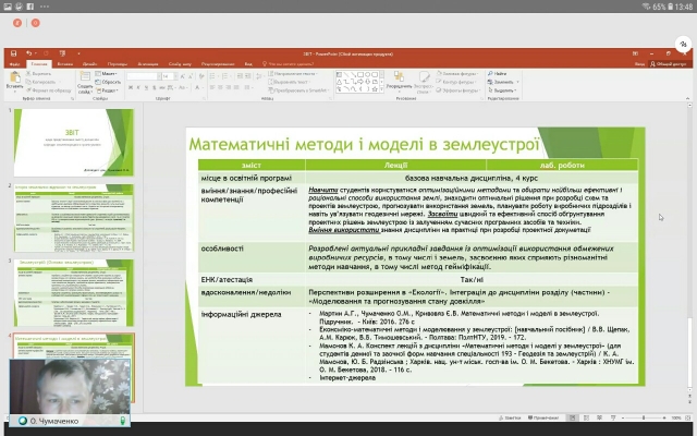 З 9 по 15 квітня на кожній кафедрі відбулися розширені онлайн-засідання за участі комісії факультету у складі голови – Тараса Євсюкова, д-ра екон. наук, професора, декана факультету землевпорядкування; членів комісії: Івана Ковальчука, д-ра геогр. наук, професора, завідувача кафедри геодезії та картографії, гаранта освітньо-професійної програми першого (бакалаврського) рівня вищої освіти спеціальності 193 «Геодезія та землеустрій»; Андрія Мартина, д-ра екон. наук, професора, завідувача кафедри землевпорядного проектування, гаранта освітньо-професійної програми другого (магістерського) рівня вищої освіти спеціальності 193 «Геодезія та землеустрій»; Олександра Шевченка, к.е.н., доцента, заступника декана факультету землевпорядкування з навчальної та виховної роботи; секретаря/координатора Олени Малашевської, к.е.н., ст. викладача кафедри геодезії та картографії; Анатолія Полтавця, голови Всеукраїнської саморегулівної організації «Асоціація фахівців землеустрою України», ГО «Земельна спілка України» Андрія Кошиля, генерального директора компанії «Кайлас» Андрія Галайди, науково-педагогічних працівників кафедр, студентів бакалавратури та магістратури.