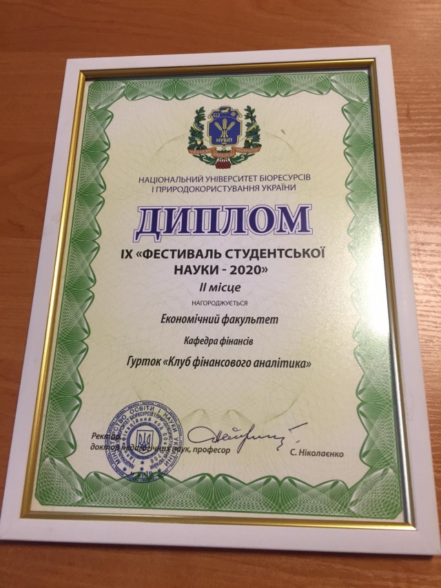 Студент 2 курсу скороченого терміну навчання Гудзь Олексій на високому рівні представив наш університет у ІІ етапі Всеукраїнського конкурсу наукових робіт зі спеціальності «Менеджмент інвестиційної та інноваційної діяльності» отримавши диплом ІІІ ступеня за наукову роботу «Оцінка інвестиційної привабливості аграрних підприємств», яка була виконана під керівництвом к.е.н., старшого викладача кафедри фінансів Тітенко З.М. В 2020 році науковий гурток «Клуб фінансового аналітика» на IX «Фестивалі студентської науки» отримав диплом ІІ ступеня.