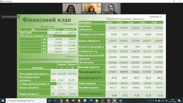 Представлені проекти були актуальними, цікавими та різноплановими із детальними розрахунками потреби в інвестиційних ресурсах, та прогонами ефективності, а саме чистої теперішньої вартості, внутрішньої норми доходності, рентабельності інвестицій та терміну окупності.