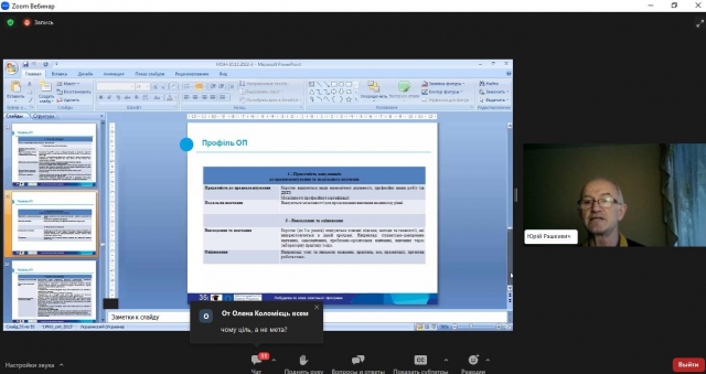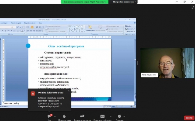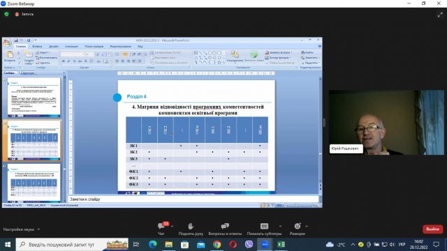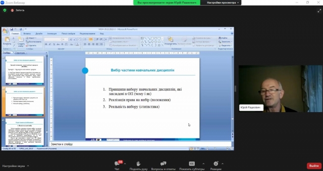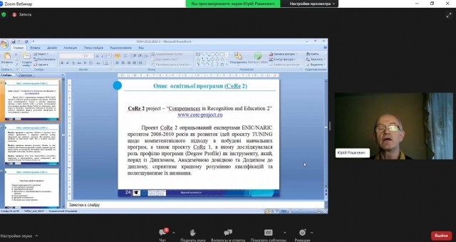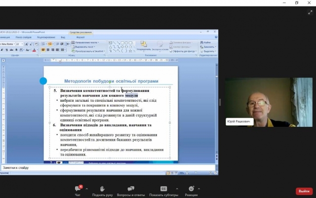 Спікери заходу Юрій Рашкевич, член Національного агентства кваліфікацій, доктор технічних наук, професор виступив з доповіддю на тему «Програми вибіркових дисциплін: завдання та особливості розроблення», в якій наголосив про важливість визначення грамотних компетенцій та визначив ключові компетенції. Спікер ознайомив слухачів з Європейською рамкою кваліфікацій для навчання впродовж життя.