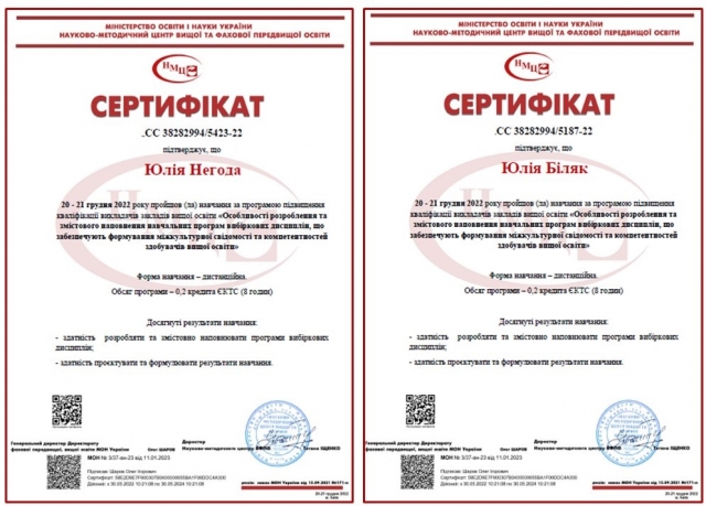 Міністерством освіти і науки України 20–21 грудня 2022 року проводилося підвищення кваліфікації за напрямом: «Особливості розроблення та змістового наповнення навчальних програм вибіркових дисциплін, що забезпечують формування міжкультурної свідомості та компетентностей здобувачів вищої освіти». До участі в підвищені кваліфікації долучилися викладачі кафедри фінансів д.е.н., професор, гарант ОПП «Фінанси і кредит» Юлія Негода та к.е.н., доцент, гарант ОПП «Корпоративні фінанси» Юлія Біляк.