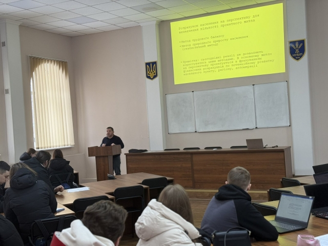 Лектором були розкриті поняття та особливості використання земель житлової та громадської забудови у сучасних умовах, а також охарактеризовано рівні містобудівної документації. Під час заняття лектор ознайомив студентів як застосувати класифікатор видів цільового призначення земельної ділянки у різних ситуаціях. Студенти та присутні науково-педагогічні працівники мали можливість побачити схеми (моделі) різних видів житлової забудови (лінійна, периметральна, групова).