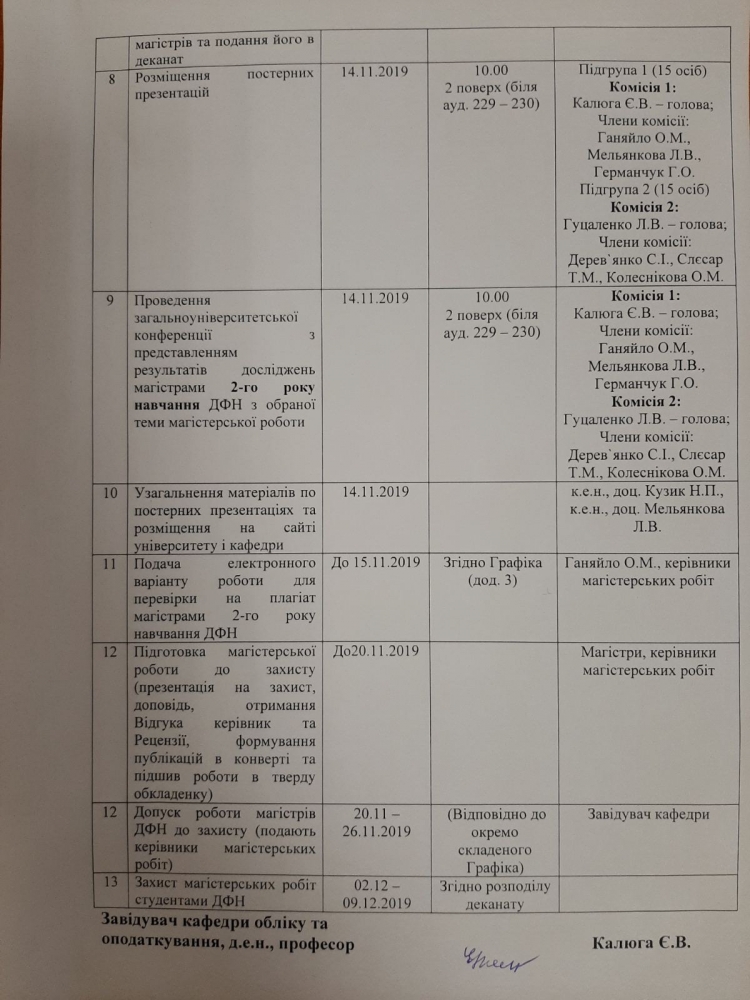 Завідувач кафедри обліку та оподаткуванняд.е.н., професор Є.В. Калюга Секретар к.е.н., доцент кафедри обліку та оподаткування Т.О. Гуренко Додаток 3 Проведення атестації магістрів ДФН 2-го року навчання(заповнення індивідуальних планів магістра, подання в електронному варіанті виконаної магістерської роботи) Підгрупа 1 (15 осіб) Комісія 1: д.е.н., проф. Калюга Є.В. – голова;Члени комісії: к.е.н., доц. Данілочкіна О.В., к.е.н., доц. Мельянкова Л.В., ст. викладач Криворот О.Г. З 11.00 до 12.00 год.