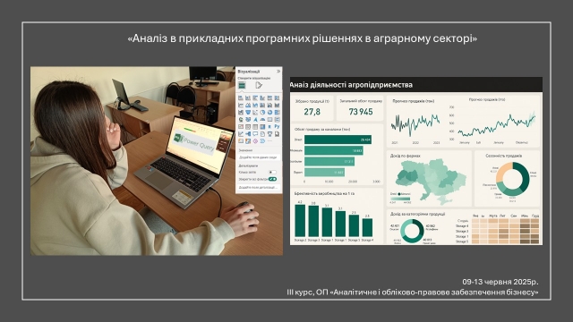 У перші тижні червня 2025 року студенти третього курсу освітньої програми "Аналітичне і обліково-правове забезпечення бізнесу" успішно пройшли навчальну практику з дисципліни "Аналіз в прикладних програмних рішеннях в аграрному секторі".