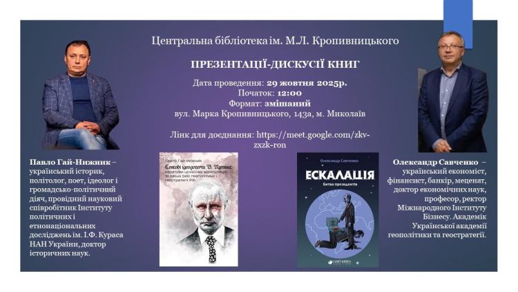 Вельмишановні пані і панове, запрошуємо на презентації-дискусії книг