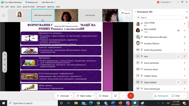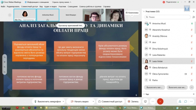 Доповіді учасників конференції вирізнялися багатовекторністю досліджень, цікавим підходом до розкриття проблематики досліджень, практичними рекомендаціями щодо розвитку облікового, аналітичного та правового забезпечення управління підприємствами економіки України в умовах сучасних викликів, що викликало жваві обговорення та дискусії.