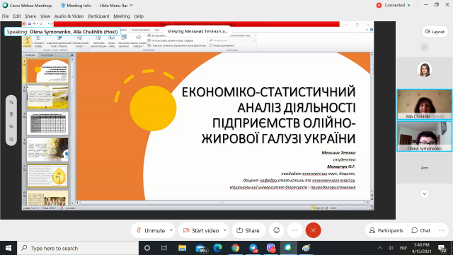 Мельник Тетяна Ігорівна з доповіддю на тему «Економіко-статистичний аналіз діяльності підприємств олійно-жирової галузі України» (керівник к.е.н., доц. Макарчук О.Г.)