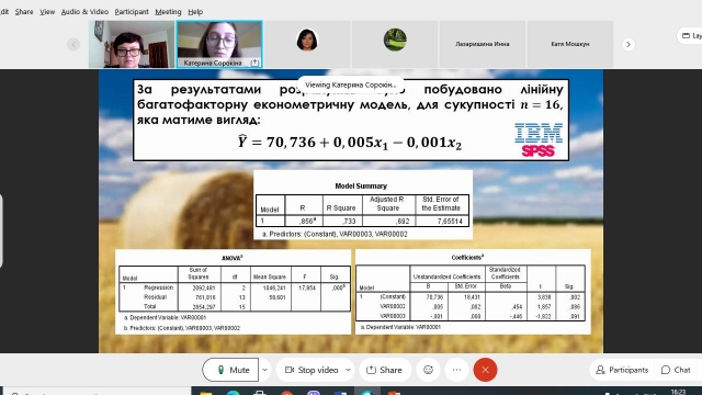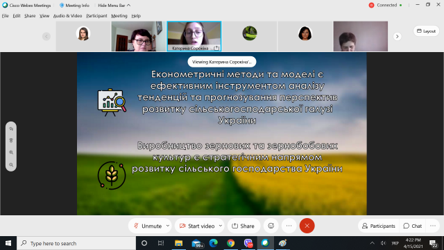 Сорокіна Катерина Владиславівна з доповіддю на тему «Економетричне моделювання та прогнозування виробництва зернових та зернобобових культур» (керівник - к.е.н., доц. Симоненко О.І.)