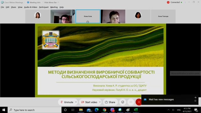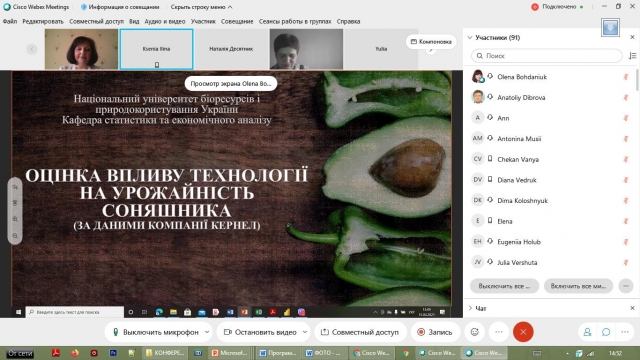 Кривошея Анна Юріївна з доповіддю на тему «Статистичний аналіз урожайності зернових і зернобобових культур в Україні» (керівник – к.е.н., доц. Чухліб А.В.)