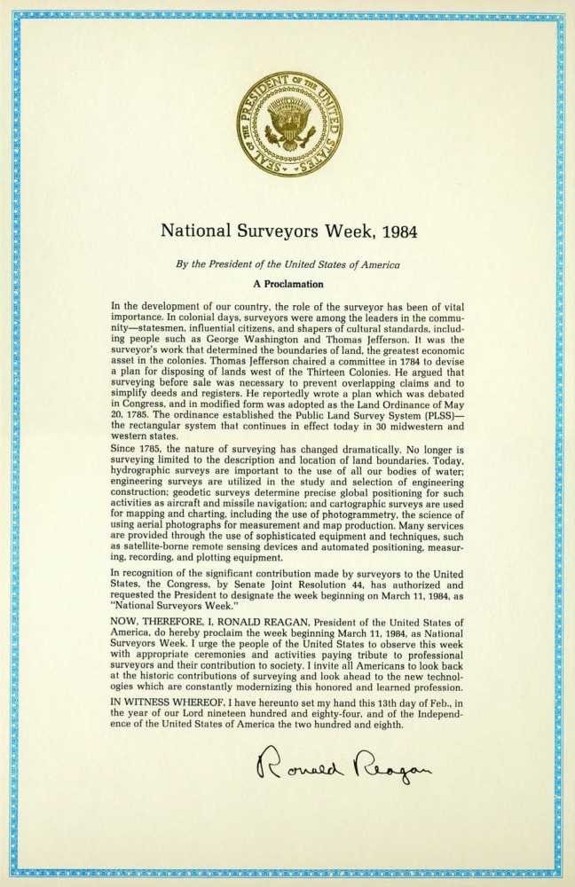 ЗАРАЗ, ТОМУ, Я, РОНАЛЬД РЕЙГАН, Президент Сполучених Штатів Америки, оголошую тиждень, що починається 11 березня 1984 року, як Національний тиждень землемірів. Я закликаю народ Сполучених Штатів відзначати цей тиждень відповідними церемоніями та подіями, віддаючи належну шану професійним землемірам та їхньому суспільному внеску. Я пропоную всім американцям згадати історичний внесок землеустрою і оглянути нові технології, які постійно модернізують цю шановану і достойну професію.